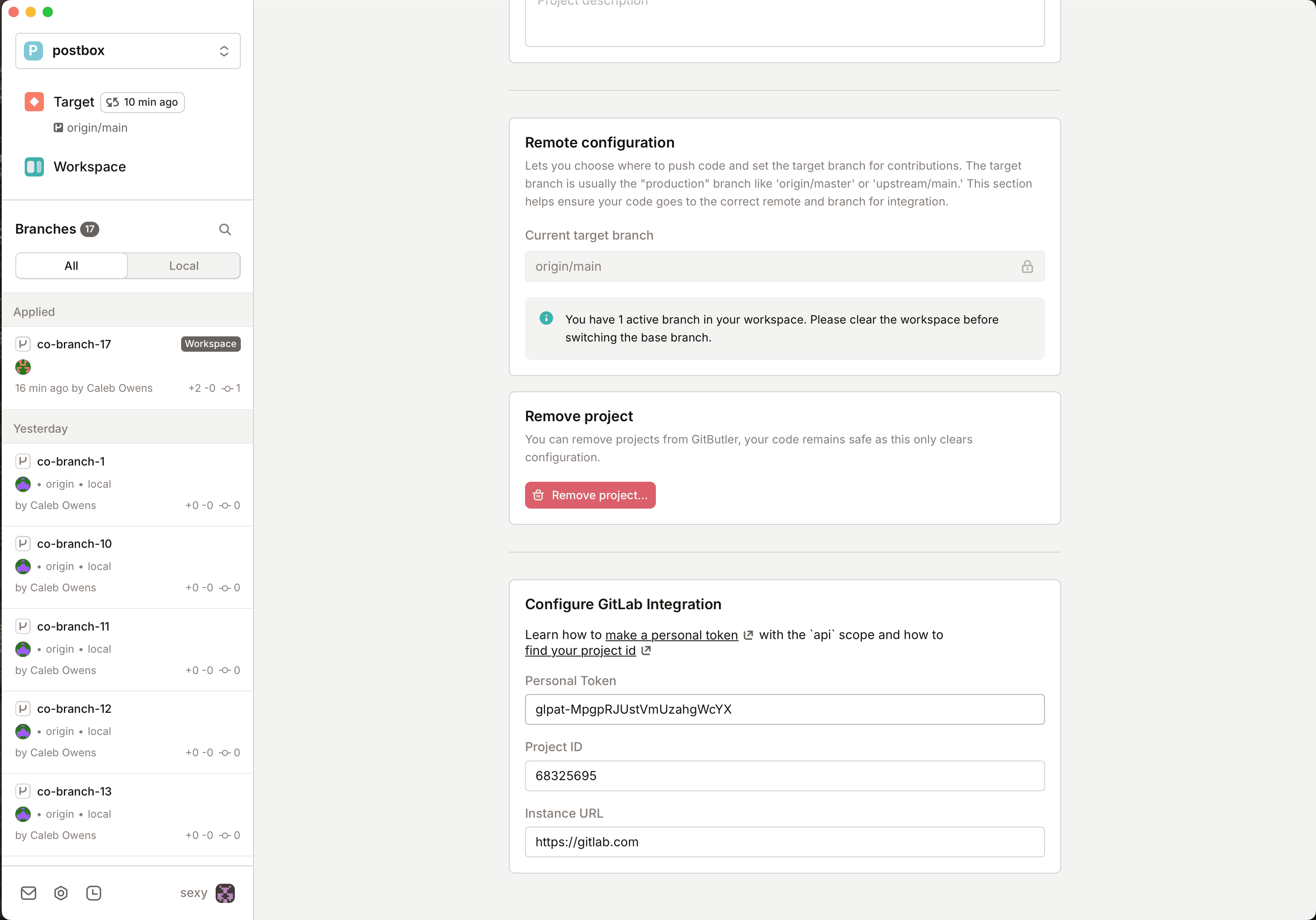 Note that if you use a custom GitLab instance, you will likely need to configure a custom CSP (Content Security Policy) to allow GitButler to connect to it. You can find more information on how to do that in the Custom Content Security Policy (CSP) section of the documentation.